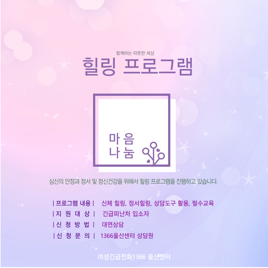 ¿©¼º±ä±ÞÀüÈ1366 ¿ï»ê¼¾ÅÍ¿¡¼´Â Èú¸µÇÁ·Î±×·¥À» ÁøÇàÇϰí ÀÖ½À´Ï´Ù