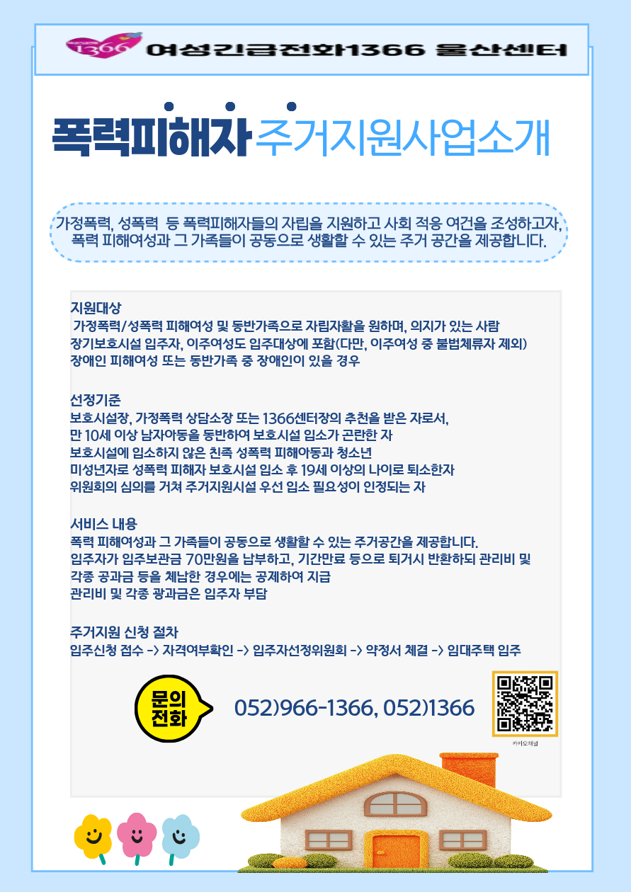 ¿©¼º±ä±ÞÀüÈ­ 1366 ¿ï»ê¼¾ÅÍ¿¡¼­´Â Æø·Â ÇÇÇØÀÚ ÁÖ°ÅÁö¿ø »ç¾÷À» Çϰí ÀÖ½À´Ï´Ù.